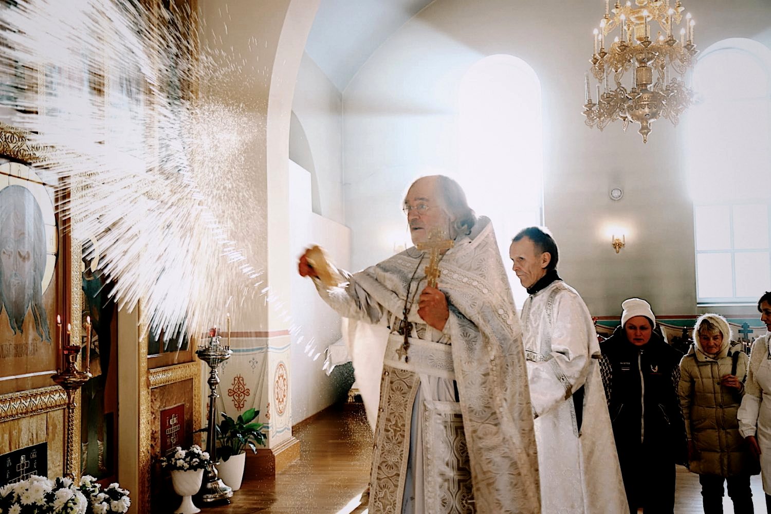 По освящении воды батюшка окропил Крещенскою водою верующих.